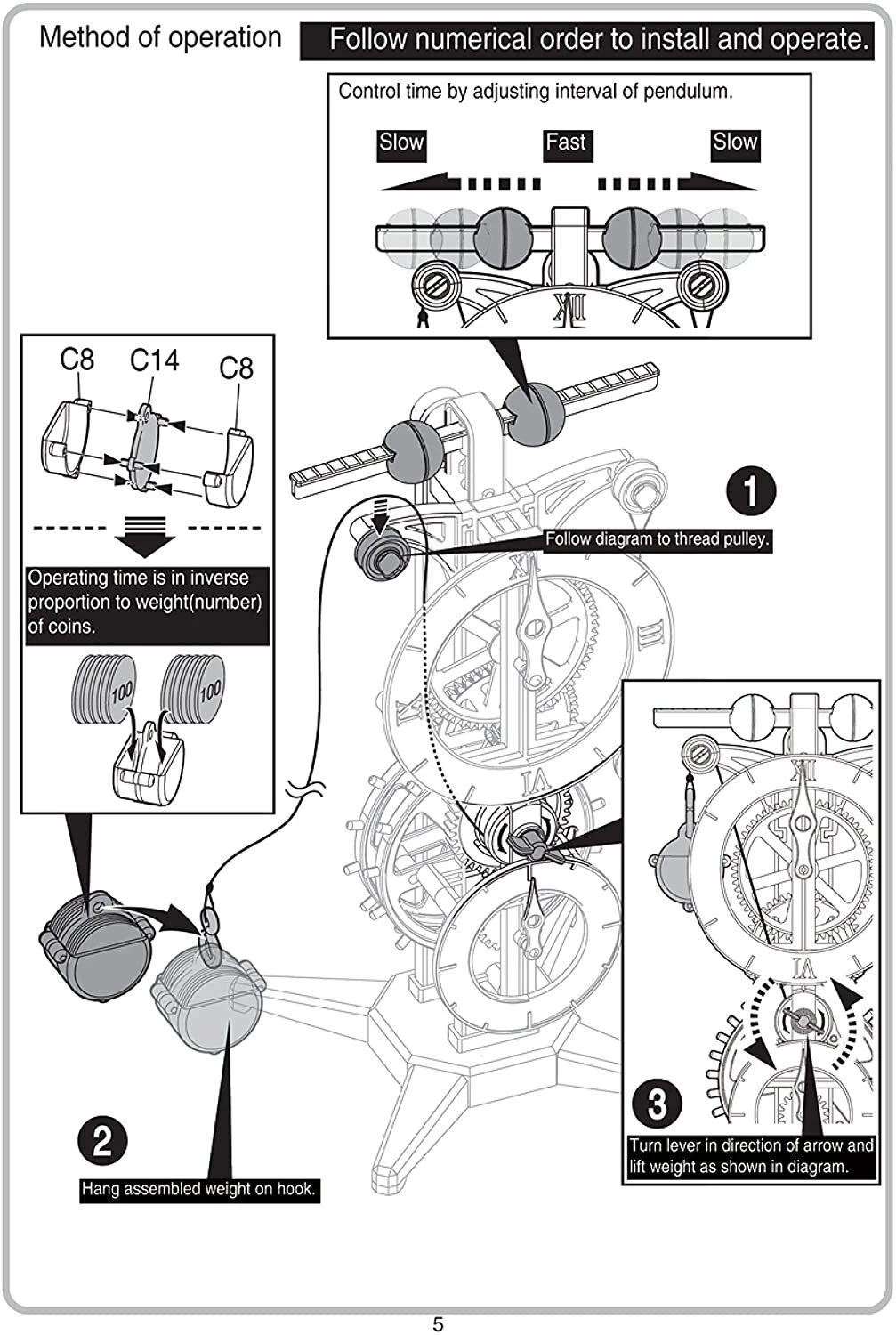 - Uses the pendulum’s weight as the power source