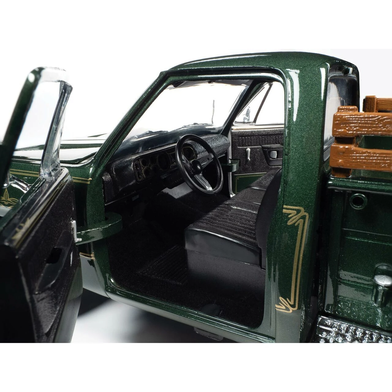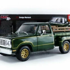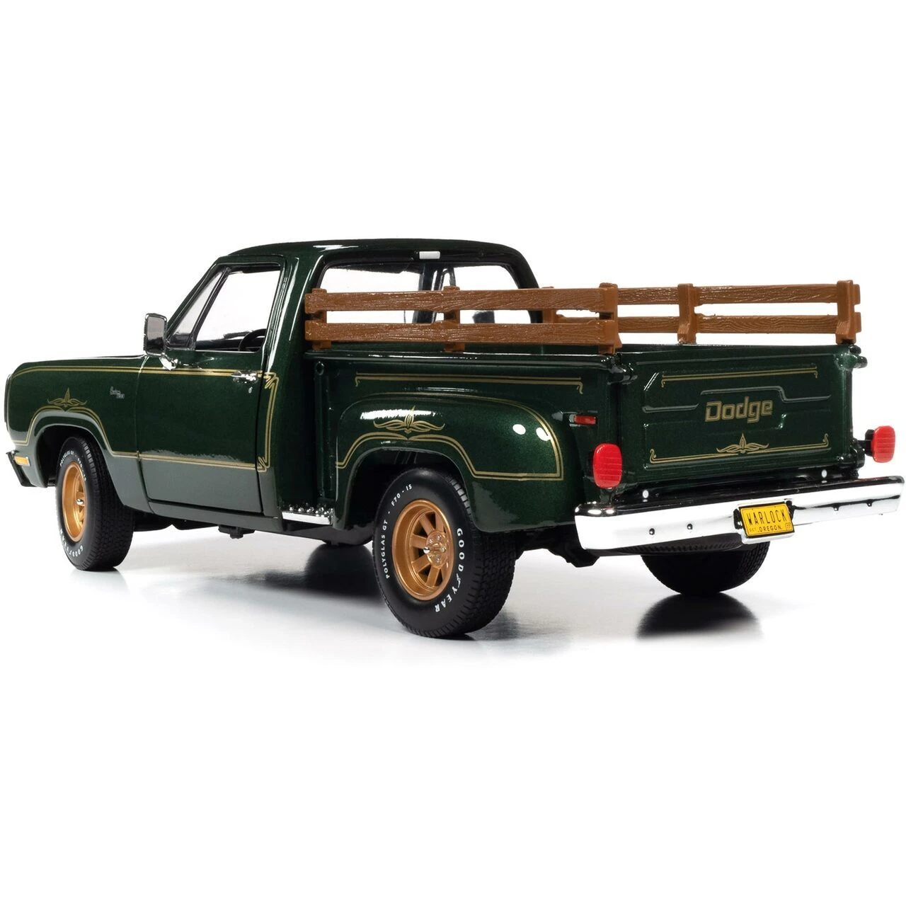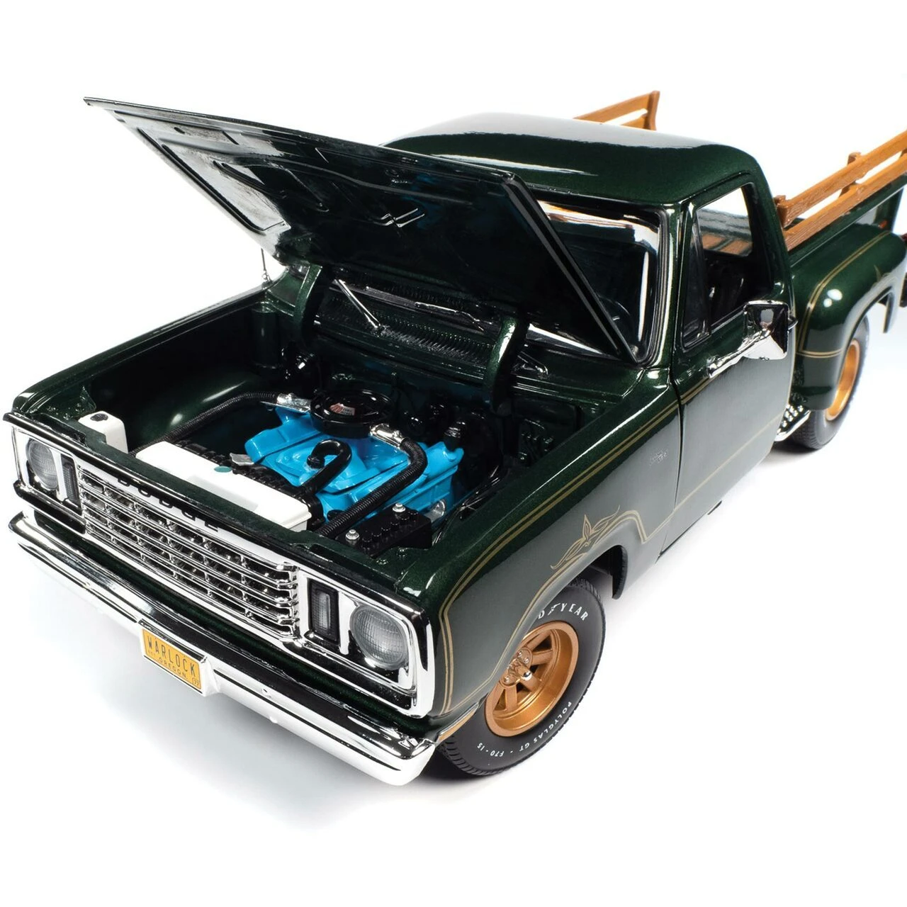 The Dodge Warlock is a short wheelbase truck that was produced in limited production in 1976 and regular production from 1977 to 1979. Its main draw was that it was a factory customized truck and was designed to appeal to 4×4 buyers. This 1:18 scale 1977 Dodge Warlock pickup truck diecast model features an opening hood, doors, and tailgate. The collectable also features rubber tires, poseable steering, and detailed interior—along with a plumbed and wired 318 engine. Each Dodge Warlock truck is finished in Medium Green Sunfire Poly paint and gold pinstrips just like the original.