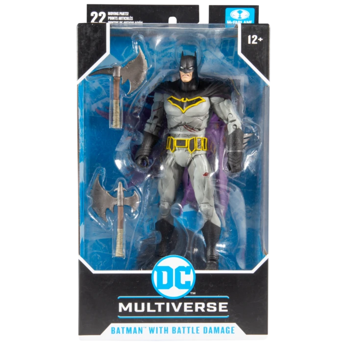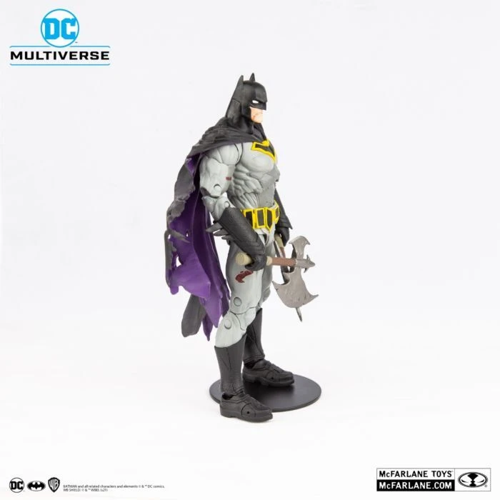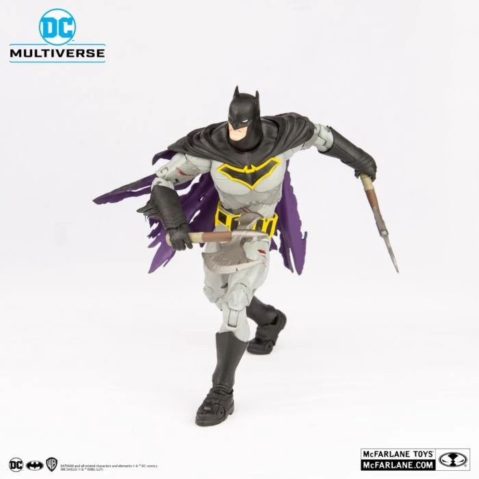 Based on his look in Dark Nights: Death Metal, the Batman Battle Damaged DC Multiverse 7” Scale Action Figure captures the Dark Knight in his tattered cape and battle-worn costume, and wielding dual axes to slay his enemies. The highly detailed action figure features an ultra articulation design with over 20 points of articulation for dynamic posing, and comes complete with a figure base and a collectible art card with Batman artwork on the front and a character biography on the back.