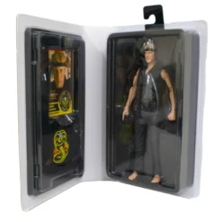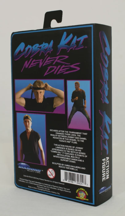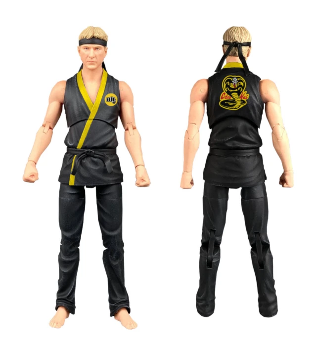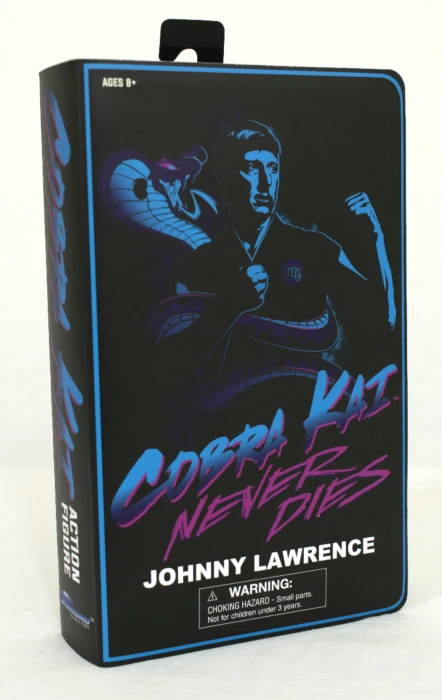 With the appearance of an old-school VHS cover on the outside, opening the box reveals the action figure, a display base, and a Cobra Kai trading card behind windowed compartments. The detailed figure takes on an accurate likeness of Johnny Lawrence in his karate gi, as played by William Zabka. Complete with over 16 points of articulation, it’s also perfect for recreating countless martial arts poses.