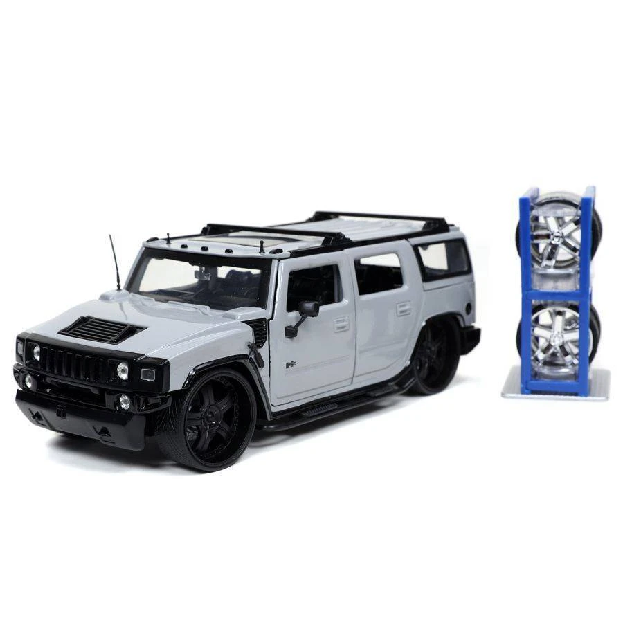 Crafted in durable materials including 100% die-cast metal and premium rubber tyres, this authentically licensed replica of the Hummer H2 with Tyre Rack features an accurate paint job, detailed interior, stylised wheels, plus an opening hood, and doors. This awesome replica also comes with an extra set of wheels, tyre rack, and a screwdriver