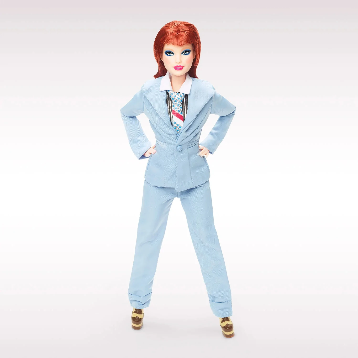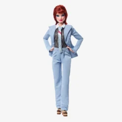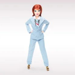 Barbie introduces a second collectible doll honoring the ultimate pop chameleon, David Bowie, who continues to be recognized as a cultural vanguard. To commemorate the 50th anniversary of his album, Hunky Dory, this Barbie doll wears an authentic replica of the bespoke powder-blue suit Bowie wore in the “Life on Mars?” music video, complete with a foil-printed pin-stripe shirt, statement tie, and platform shoes. Her bold blue eyeshadow and a hairstyle inspired by Bowie’s ‘70s glam era bring this look to life.
