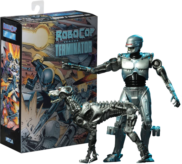 Packaged in display-friendly window box packaging with opening flap, the Robocop Vs The Terminator – Endocop & Terminator Dog 7” Action Figure 2-Pack is the perfect addition to any collection!